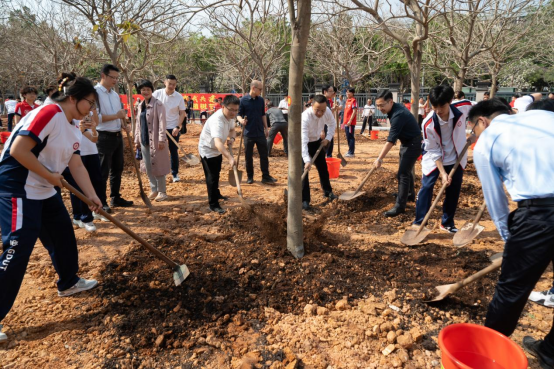 教师一同出席活动,与在校学生一起亲手植下新苗,为校园增添一抹新绿。