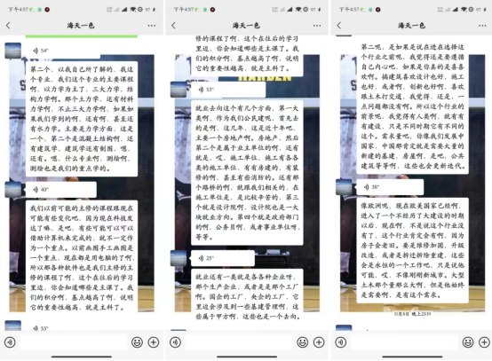 在过去的一学期里,“校友班主任”们以心交心,从“过来人”、“从业者”的角度,为土木学子们提供了大量宝贵的经验借鉴,与土木学子们形成了亦师亦友的关系。一位同学就表示:“我与师兄(即‘校友班主任’)加上了微信。他非常耐心,即使工作繁忙也抽空为我答疑解惑。原本我还不太了解土木行业的工作,总是在烦恼以后要做什么。但经过师兄的讲解,我现在逐渐找到了方向,有了初步的就业想法。真的多亏有他!”