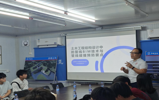 饭后,罗隐成老师、谢燕老师、荔湾区住建园林局高级工程师严嘉鸣与同学们开展了师生座谈会。会上,罗隐成老师进行了“土木工程结构设计中的管线BIM技术与管线碰撞预防要点”的主题分享,同学们争先提问着行业的现状、未来发展的难题、学业难题等。老师们耐心指导,一一解答同学们的疑惑,为同学们未来职业生涯发展打下一针“强心剂”。有同学直言:“老师,现在我的目标就是努力学习,毕业的时候能让您招我!”