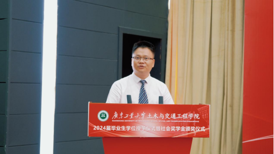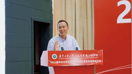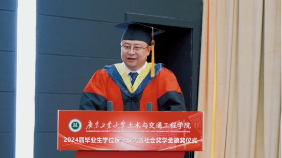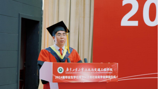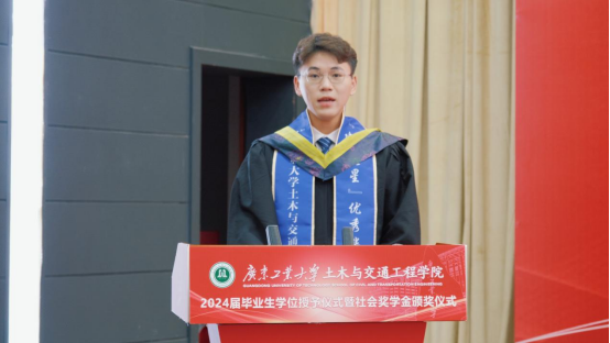 在本次仪式上集中颁发2024年“建设之星”优秀毕业生暨中山环宇“锚牌”奖学金、2023年何耀陵“锚牌”推免生奖学金、2024年中海达奖学金、2023年华创测绘奖学金、2024年 “(广工大)粤飞翔土木奖学金等五项社会奖学金。合作企业充分发挥社会责任感,助力Toptoon育人事业蓬勃发展,校友们干霄凌云,激励了一代又一代土木学子茁壮成长。中山环宇有限公司财务总监曾镇国作为企业代表发言,他鼓励同学们饮水思源,苦练本领,寄语同学们常怀感恩之心,胸怀报国之志。