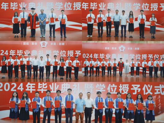 拨穗正冠、毕业礼成。2024届毕业生有序登台,赵志伟、郭永昌、吴希文、姜海波、冯为民、梁仕华、杨晚生7位授位教授与毕业生逐一亲切握手、正冠拨穗、颁授学位证书并合影留念。浓浓深情溢于言表,共同铭记学生生涯的高光时刻。