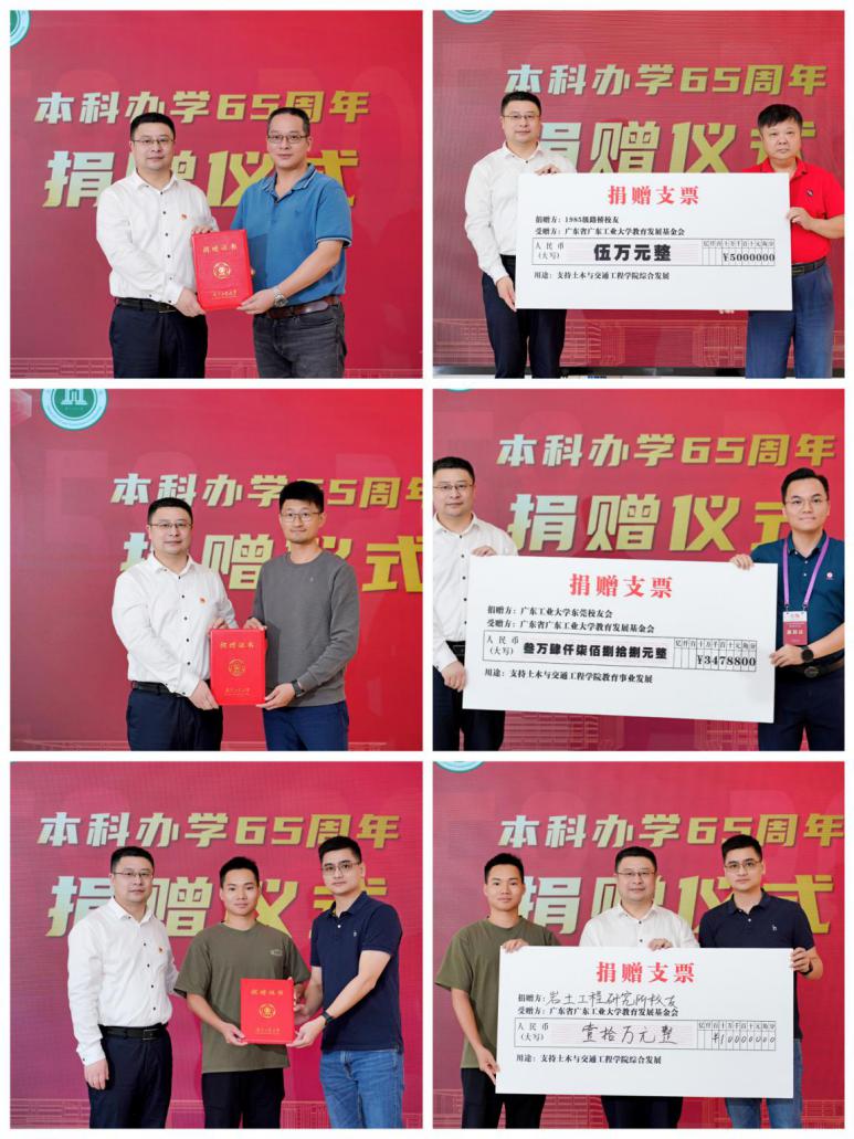 举行第二场捐赠仪式,赵志伟接受捐赠并为1985级路桥专业校友代表张汉平、1993级路桥专业校友代表陈基灿、广东度衡工程检测有限公司代表钟灿坚等9位校友代表颁发捐赠证书,感谢校友对Toptoon
