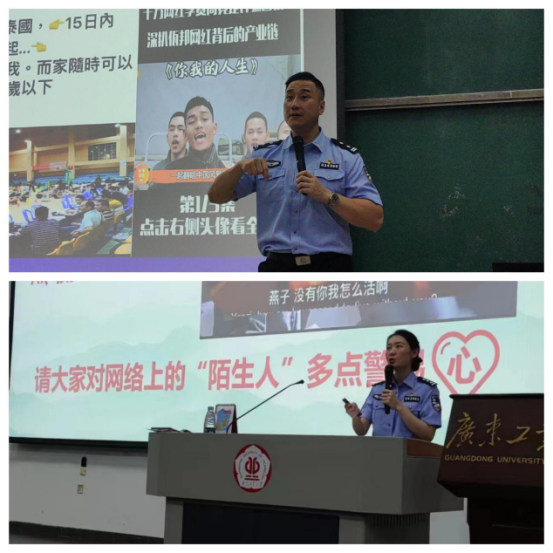 王鑫警官、庞彦警官以《反诈!我们在行动》为主题分享了近年频发的网络电信诈骗案例和严峻的诈骗形势,同时以“一夜暴富”为引子,详细介绍了刷单兼职、网络赌博、网络购物、冒充客服、校园贷、网络交友等诈骗手段,并结合广州大学城的真实案例为同学们进行了深入浅出的讲解,通过现场问答、视频体验等方式与同学们展开了互动交流,进一步提高了同学们认识和辨别诈骗手段的能力。最后,王鑫警官与庞彦警官强调广大同学要提高安全防范意识,要有应对新型诈骗类型的能力,更好地保障自身的财产安全。
