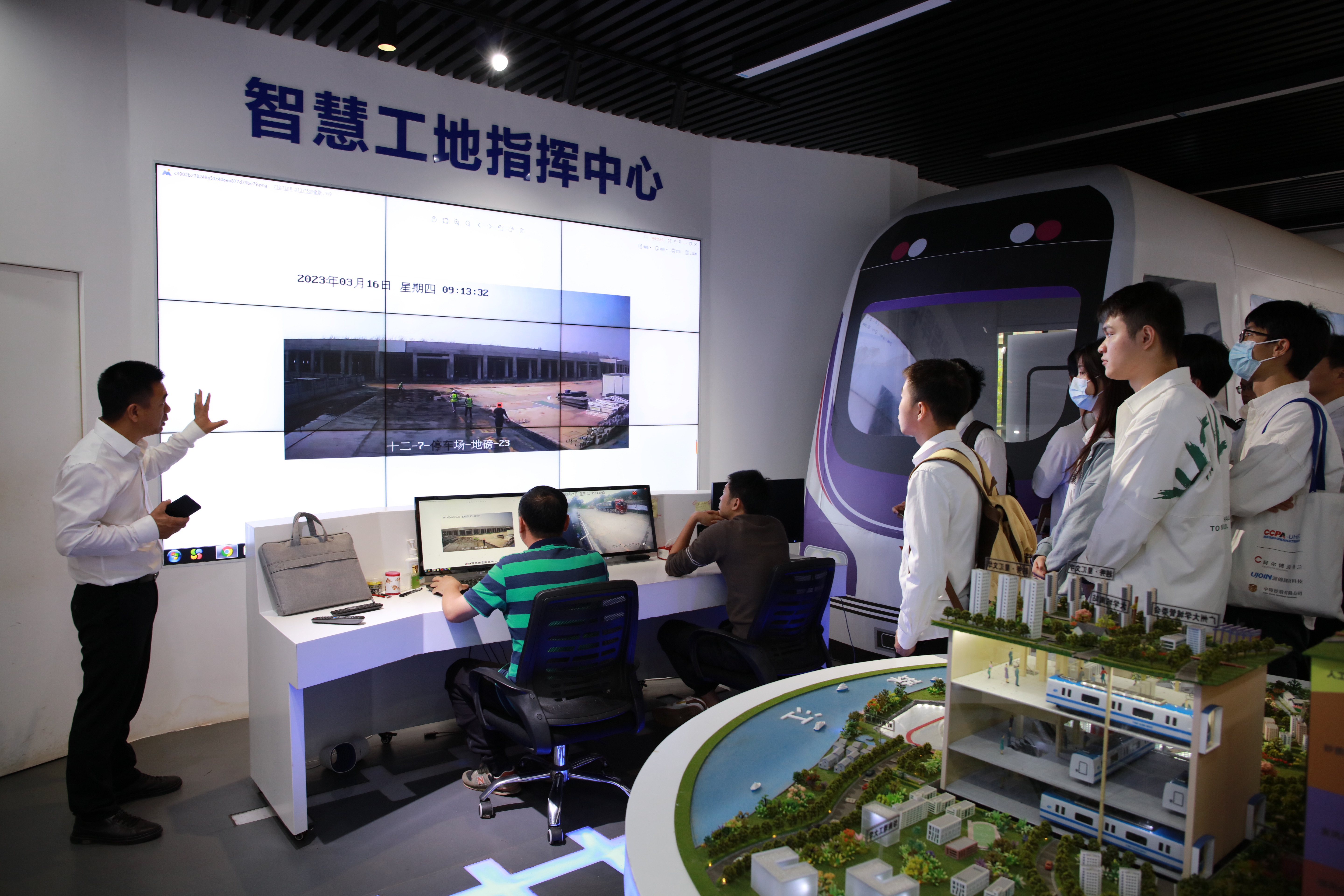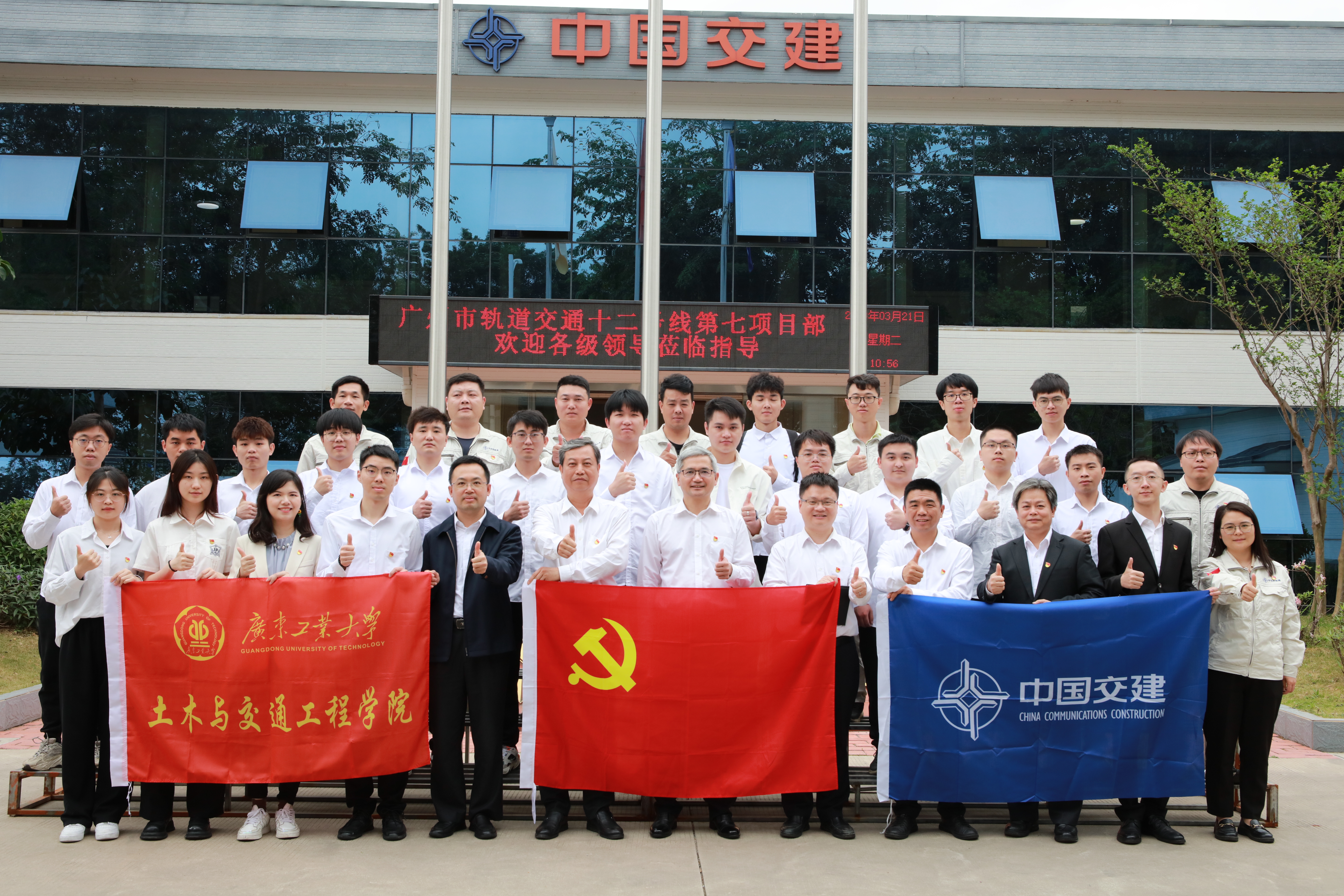 交流会后,双方合影留念,为支部共建活动点赞,为以后更高质量的合作鼓劲!接着,师生党员代表到大学城外环西路广州地铁十二号线第七项目部施工现场、安全教育体验馆、智慧工地指挥中心等进行参观学习。