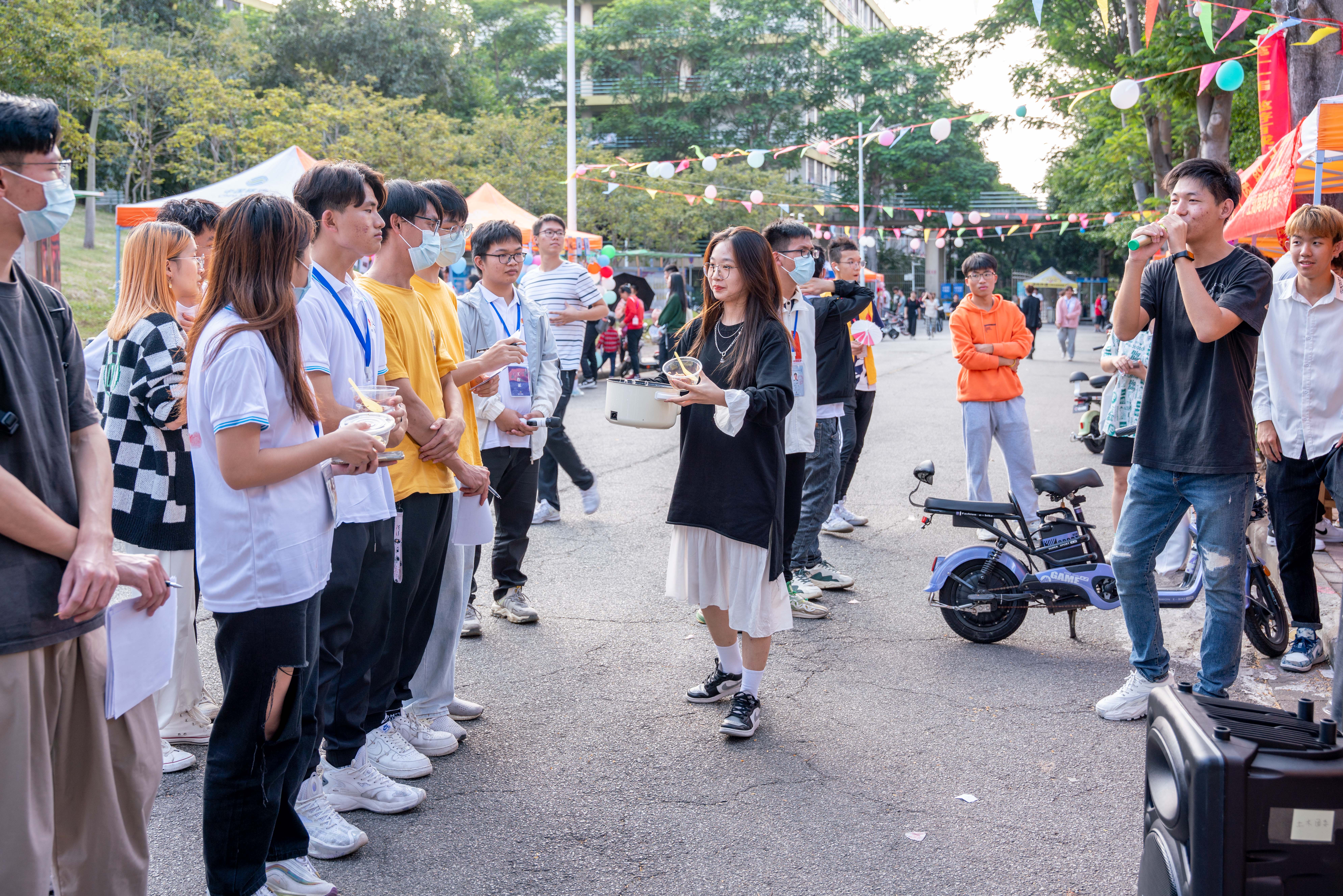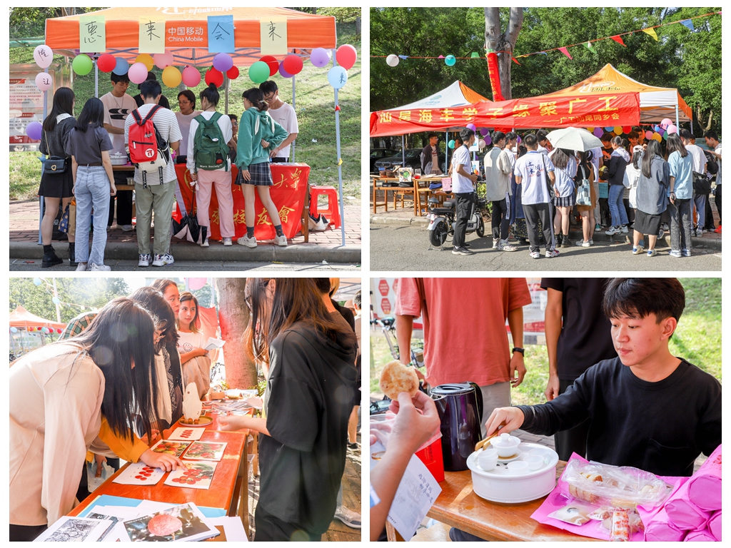 最后是城市队伍展示摊位。各城市代表队以“畅享非遗”为主题,结合城市文化定制了该地的旅游计划,并通过展示特色艺术品、歌舞、美食等方式吸引同学们驻足观赏、品尝,与此同时也向同学们宣传了当地的非遗文化,其中有饶平的功夫茶文化、新会的陈皮文化以及广西的山歌文化等。不少同学在听完队伍的介绍后表示希望可以前往当地亲身体验本地特色文化。