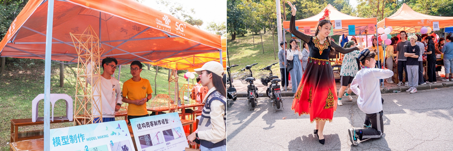 特色展位,这里有结构设计竞赛作品和赛事宣传摊位和新疆少数民族特色摊位。在结构设计赛事宣传摊位上,工作人员为同学们介绍了下一届结构设计竞赛的相关事项,并向同学们讲解杆件的制作方法。在新疆少数民族特色摊位,能歌善舞的新疆同学通过歌曲和舞蹈的方式向我们展示他们独特的文化,了解他们的生活,使我们更充分地认识到了中华文化的多样性。