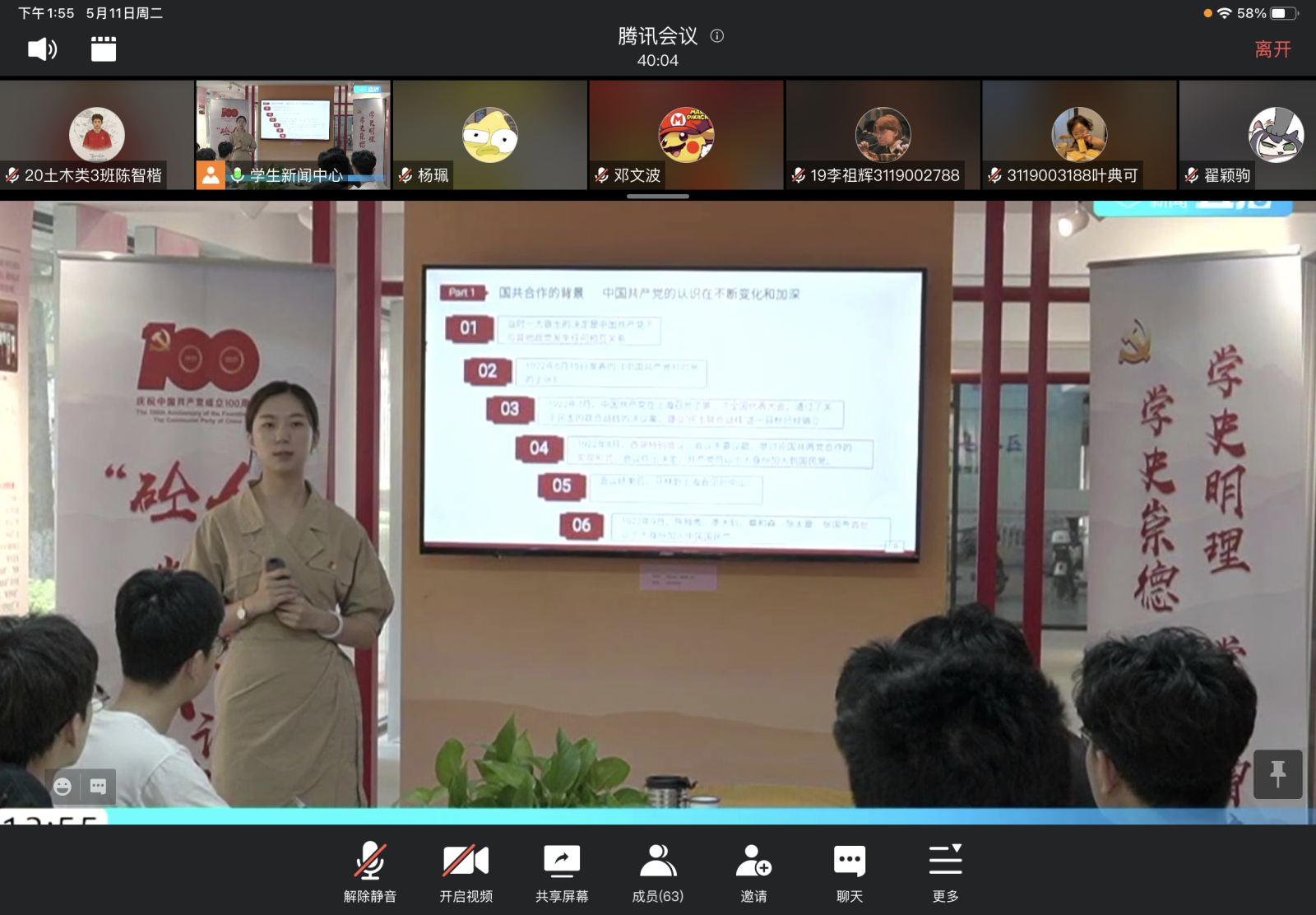 刘思利老师从国共两党首次合作的历史背景、方式、内容、成果以及失败原因等,阐述了合作的重大意义和经验教训,并详细介绍了在广州召开的推动了国共首次合作的中国共产党第三次全国代表大会。在刘思利老师引人入胜的讲解下,参与学习的学生党员、团员们对党的这段历史有了更深刻的认识,并纷纷表示,将会以今天课程的内容为线索,实地探访中共三大会址、黄埔军校旧址等爱国主义教育基地,更好地巩固与理解所学,深入学习波澜壮阔的革命故事,回顾慷慨激昂的革命岁月,汲取红色力量,做党的光荣传统和优良作风的忠实传人。