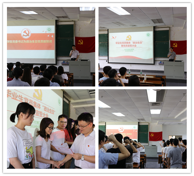 毕业生党员集体政治生日暨党员宣誓大会在庄严的国歌中拉开帷幕,首先张育广书记为政治生日党员致贺词,他向47位政治生日党员表达祝福,并强调:要铭记自己的政治生日,坚定对党的忠诚和信仰,牢记入党初心,矢志为党的事业奋斗终身。随后,张育广书记和陈颂坚副书记分别为政治生日党员赠送贺卡。土木工程系党支部梁靖波老师为大家分享了自己的入党“初心”,讲述了自己如何坚定不移的跟党走,用钉钉子的精神38年如一日默默奉献在教师岗位上,梁老师的故事和精神感染了在场的每一位党员。接着,在梁老师的带领下,全体毕业生党员重温入党誓词,新发展党员进行了入党宣誓。最后,李成瑶老师向全体毕业生党员发起文明离校倡议,从九方面要求毕业生党员在即将离校的时刻和将来的工作中,继续发挥好先锋模范作用。
