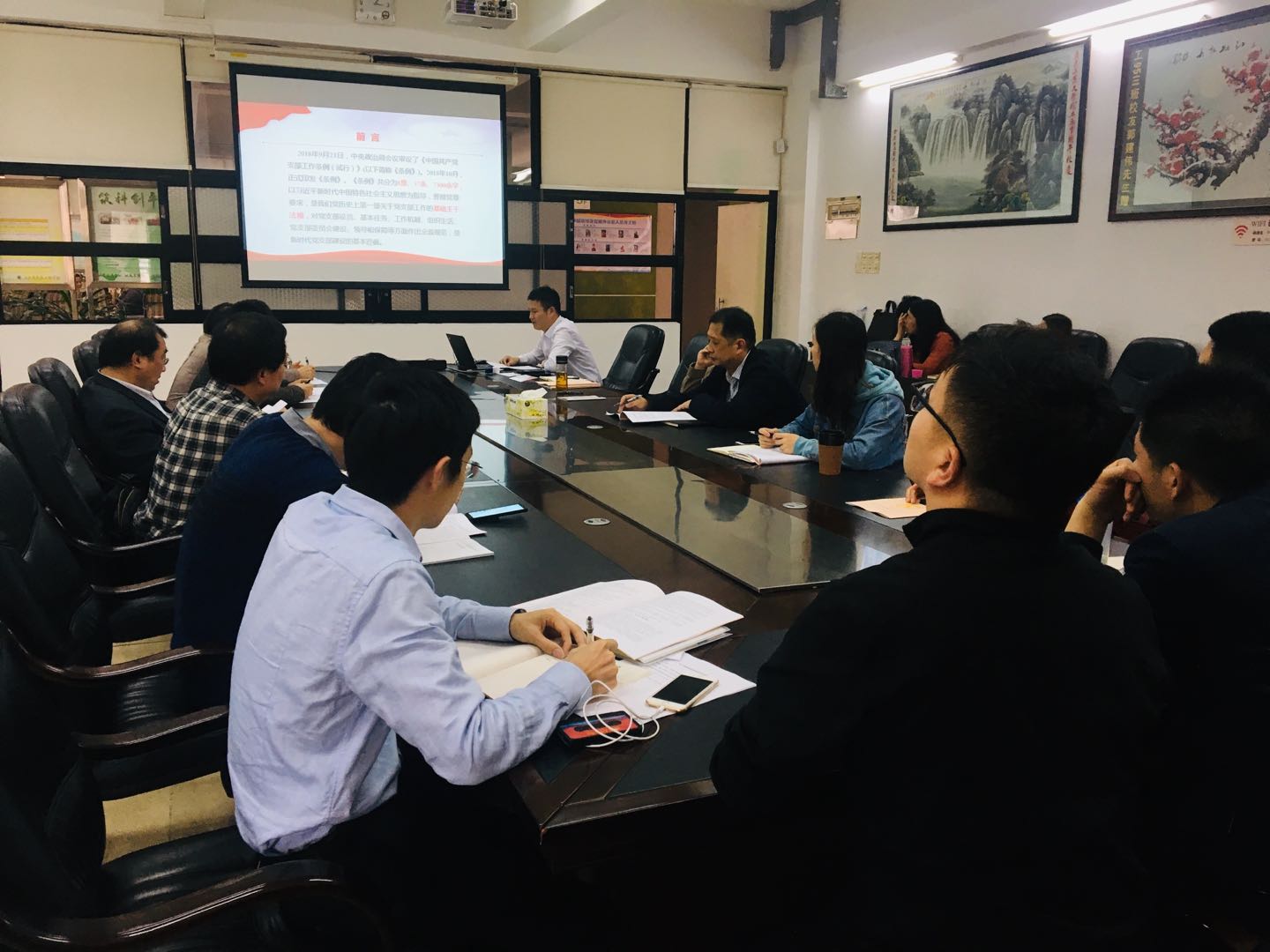 首先,张育广书记为大家按章逐条剖解原文,适时以实际情况为例详细讲解,为大家透彻深入的解读了《条例》内容,并强调各党支部要组织党员深入学习好、贯彻执行好《条例》,严格按照《条例》要求加强党支部标准化、规范化建设,进一步提升组织力。