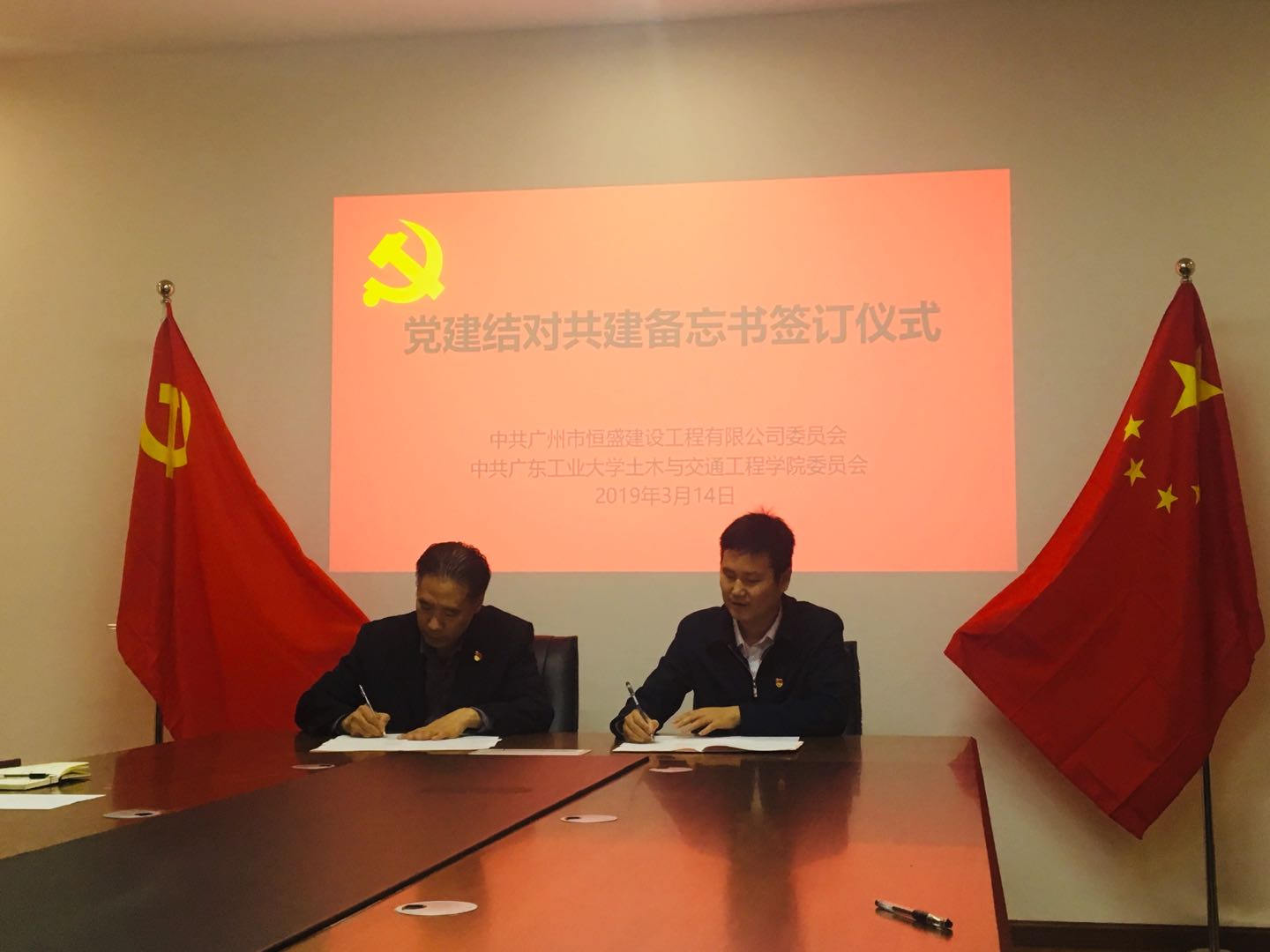 恒盛大厦项目是广州第一个高装配率的装配式建筑示范项目,大家在展馆工作人员的带领和讲解下,了解了装配式建筑的前沿技术和应用,认识到其“设计标准化、生产工厂化、施工装配化、装修一体化、管理信息化”的特征和优势。随后,双方开展座谈交流,签订党建共建备忘书。座谈会上,双方共同学习《粤港澳大湾区发展规划纲要》重要精神,结合所属行业和专业特色,商讨共建方案,以党建引领,发挥双方优势、联动互补,共同为粤港澳大湾区建设贡献力量。