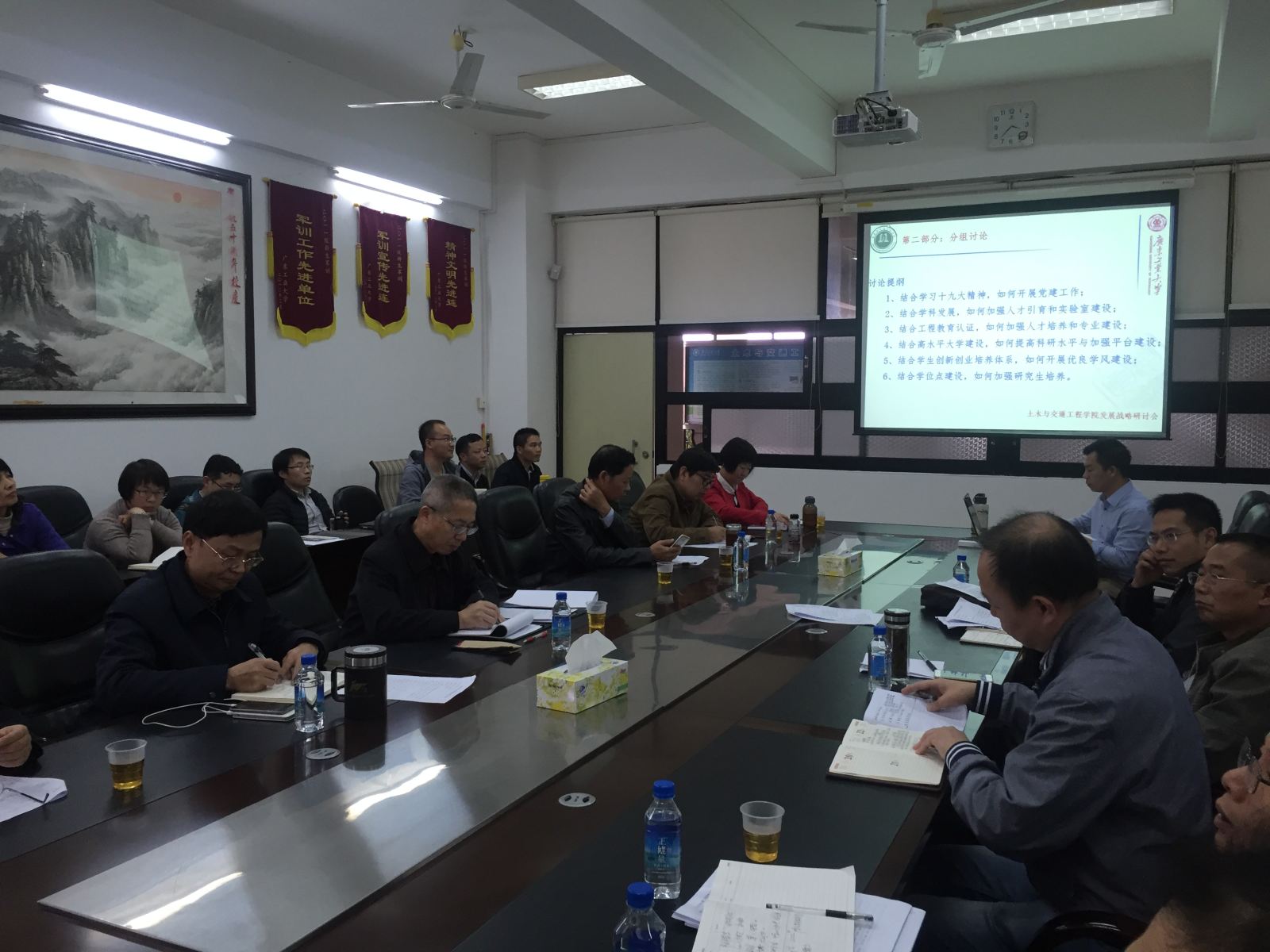 在研讨会第二阶段,与会人员进行了分组讨论,讨论主要围绕结合学习党的十九大精神,如何开展党建工作;结合学科发展,如何加强人才引育和实验室建设;结合工程教育认证,如何加强人才培养与专业建设;结合高水平大学建设,如何提高科研水平与加强平台建设;结合学生创新创业培养体系,如何开展优良学风建设;结合学位点建设,如何加强研究生培养等六个方面展开。分组讨论分别由城市公用设备系主任梅胜、实验中心主任郭永昌、工程力学研究所所长袁兵主持并做讨论情况汇报,建言献计Toptoon
