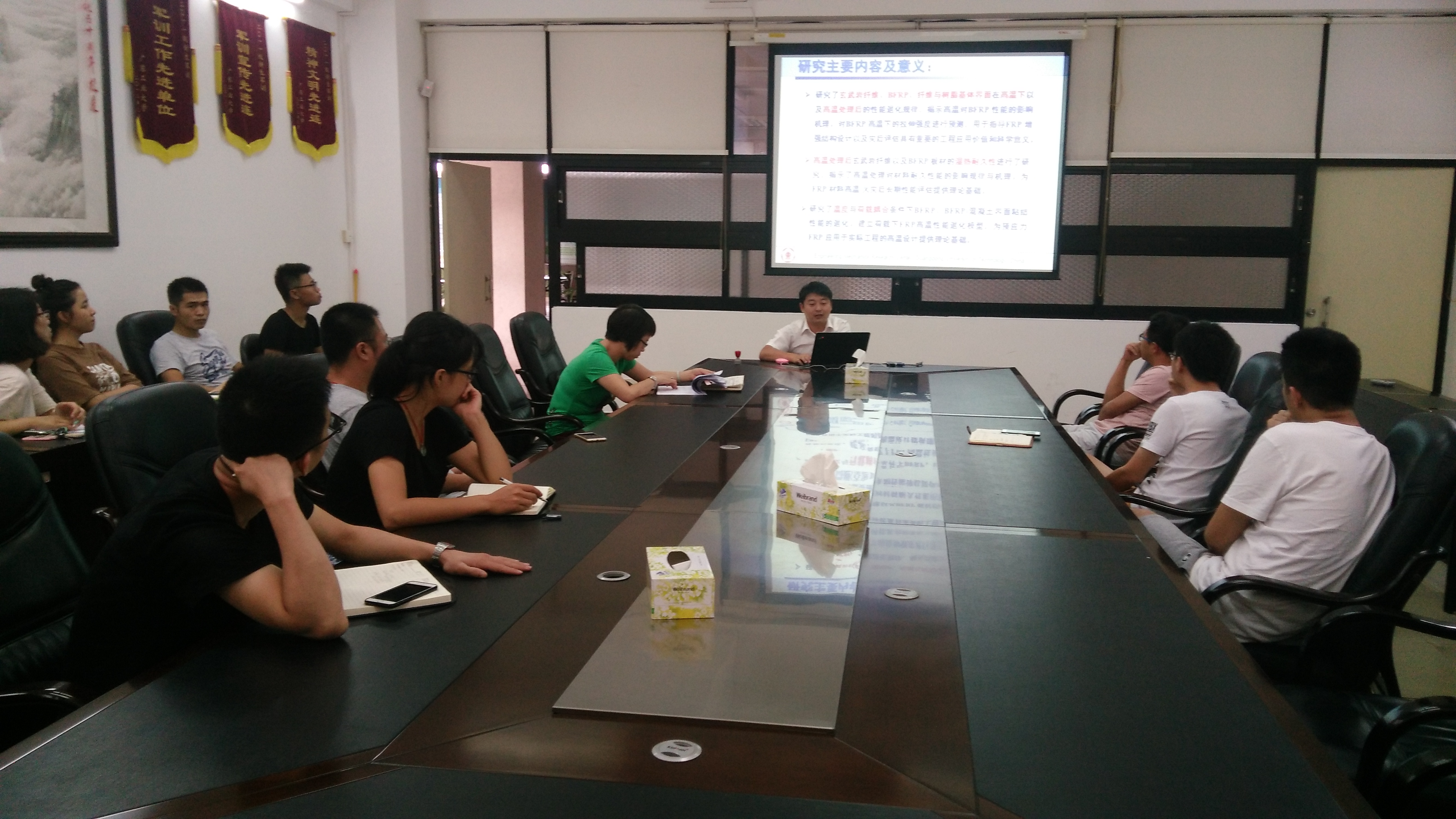 陆中宇副教授首先介绍了玄武岩纤维的材料特性和制作工艺,以及作为新型绿色高性能无机材料在工业生产和建筑领域的应用。然后详细介绍了本课题组在纤维增强复合材料(FRP)的组分改良,FRP 在高温/火灾极端环境下的性能演化规律与机理等领域所做的探索和研究。讲座结束陆中宇副教授与现场师生就玄武岩的组分和特性,氧化铝、碳酸镁、橡胶等增强玄武岩纤维耐火性能的可行性,FRP 材料的发展前景和趋势等问题跟与会者进行了讨论和交流。
