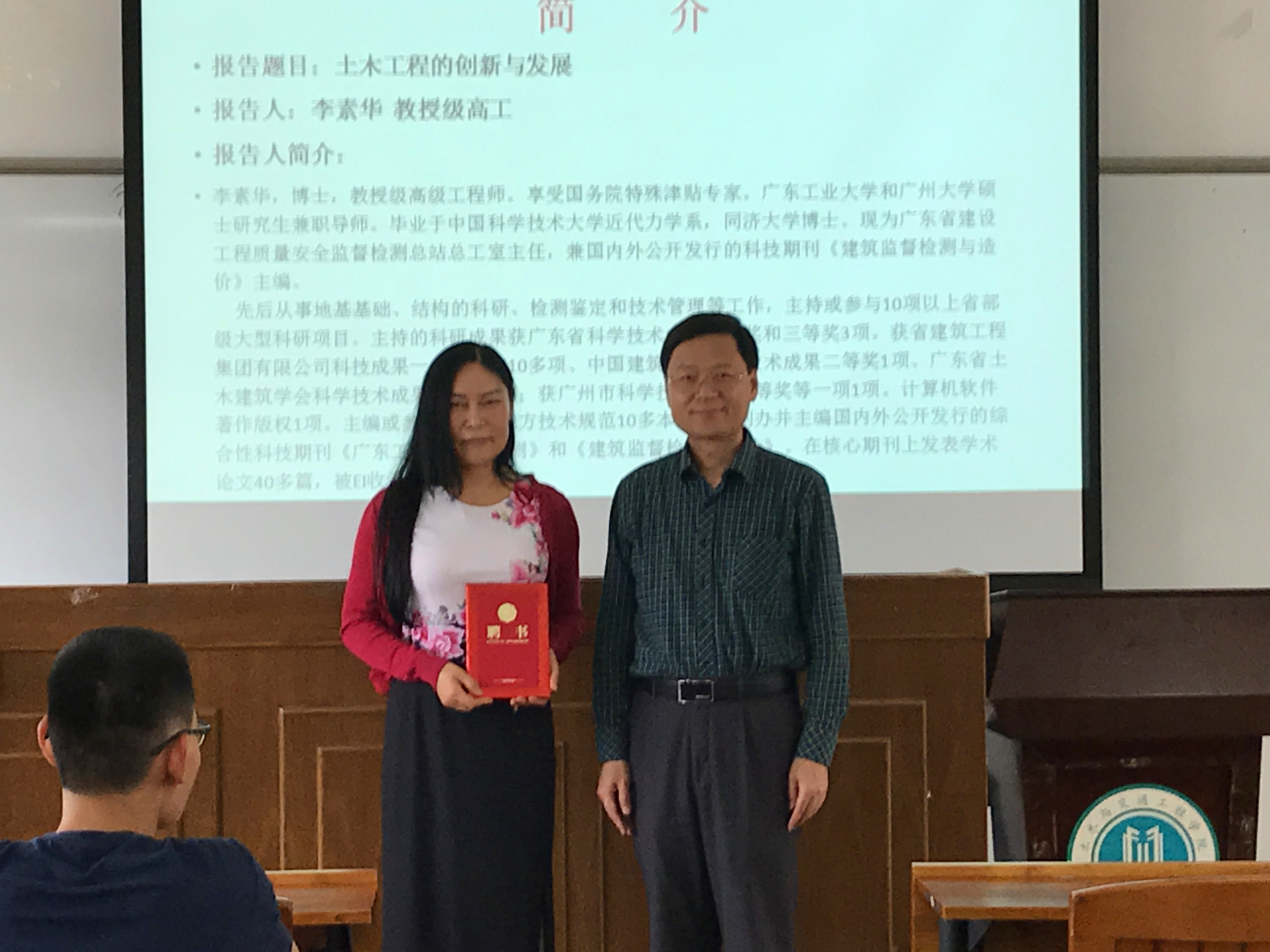 2017年5月23日下午,Toptoon第5期土木论坛----“土木工程的创新与发展”在实验二号楼520举行。本次论坛特邀了享受国务院特殊津贴专家、广东省建设工程质量安全监督检测总站总工室主任、我校硕士研究生校外导师李素华教授级高工作题为“土木工程的创新与发展”的讲座。论坛由Toptoon