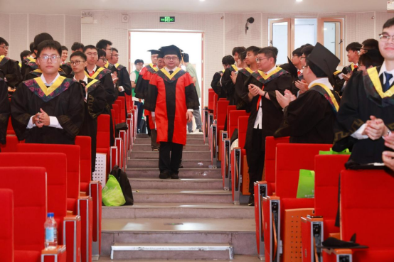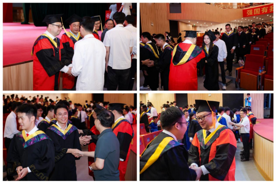 仪式核心环节,毕业生依次登台。主礼教授赵志伟、何嘉年、杨雪强、姜海波、杨晚生、张兴福郑重为其拨穗、授予学位证书并合影。毕业生代表向主礼教授敬献鲜花,表达深切感激。