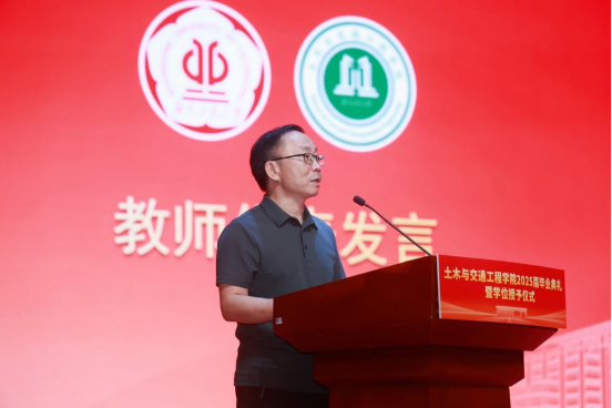 教师代表魏德宏副教授结合自身从教三十余载见证行业变迁的经历,鼓励毕业生拥抱人工智能、大数据等新兴技术重塑的新时代,并提出三点期望共勉:坚守“匠心”追求卓越,勇于创新拥抱变革,脚踏实地肩负责任。