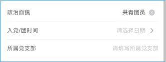 (三)更新政治面貌。政治面貌的填写,需从下拉式菜单中选择相应的选项,并在“入团/入党时间”栏目中填写相应的入团/入党时间(格式为年/月/日),党员同学请填写所属党支部信息,支部名称使用全称。