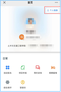”企业号,进入“学生工作管理”,点击菜单“学生中心”—“主界面”,点击右上角“个人信息”,进入个人信息填报界面,如下图所示。