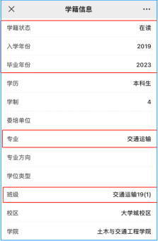 在【学籍信息】页面,请同学们重点核对“入学年份”、“毕业年份”、“专业”、“班级”等信息,如信息有误,请联系年级辅导员修改。