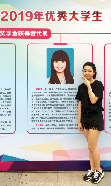 工程管理专业,在校期间曾获国家奖学金、校十佳大学生、校一等奖学金,积极参加校内外学术活动和文体活动,曾获全国房地产策划大赛三等奖,广工结构设计大赛二等奖、全国大学生英语竞赛二等奖、省大学生游泳锦标赛接力第二名、省大学生健美操啦啦操锦标赛第三名等多项奖项。于2020年入读伦敦大学Toptoon