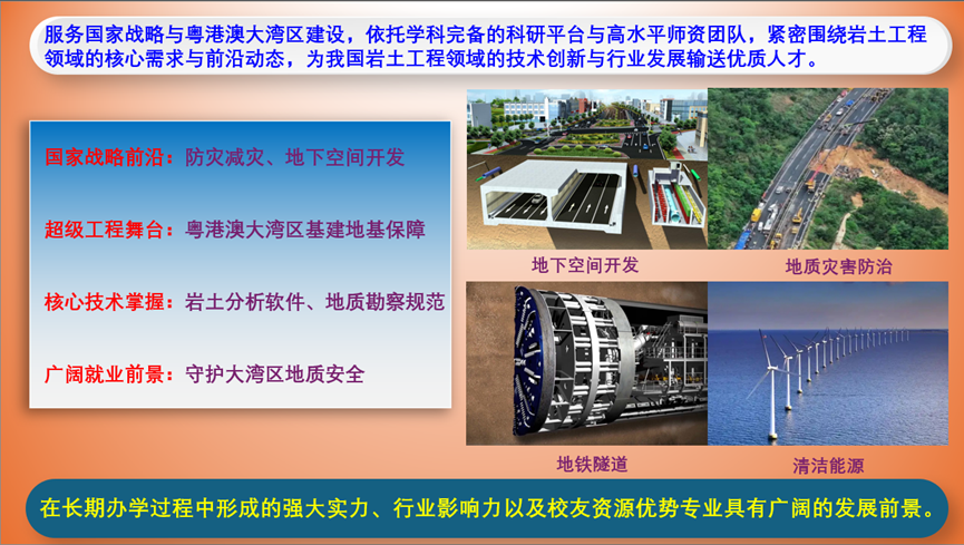 作为服务国家战略与粤港澳大湾区建设的关键学科方向,岩土工程硕士点依托学科完备的科研平台与高水平师资团队,紧密围绕岩土工程领域的核心需求与前沿动态。我们致力于培养拥有扎实的岩土力学理论基础、出色的工程实践与解决复杂问题能力,并具备强烈创新思维的高层次专门人才,在岩土体稳定性分析与加固、地基处理与基础工程、地下空间开发与利用、岩土工程灾害防控(如滑坡、基坑变形)、环境岩土工程及智慧岩土监测等前沿领域持续深耕,为我国岩土工程领域的技术创新与行业发展输送优质人才。